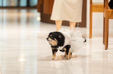 ソルミエで行われた人前式は、 大切なゲスト一人ひとりに見守られながら誓う、 あたたかさに満ちた挙式となりました。 リングドッグの登場には、会場から思わず笑顔がこぼれ、 緊張の中にも和やかな空気が広がります。 形式にとらわれず、おふたりらしい言葉で想いを伝える時間は、 ゲストの心にも深く残るひとときとなりました。