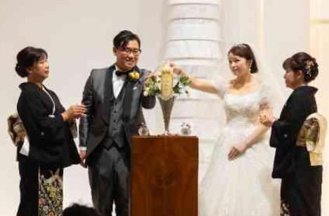 挙式の中で行われたユニティキャンドルは、 これまで別々の人生を歩んできたおふたりが、 ひとつの光を灯すことで、 「これから同じ人生を歩んでいく」ことを表す大切なセレモニー。 静かに灯るキャンドルの光には、 これまでの感謝と、これからの未来への決意が込められていました。 華やかさの中に、心に深く残る時間が流れ、 ゲストの記憶にもそっと刻まれる、印象的なワンシーンとなりました。