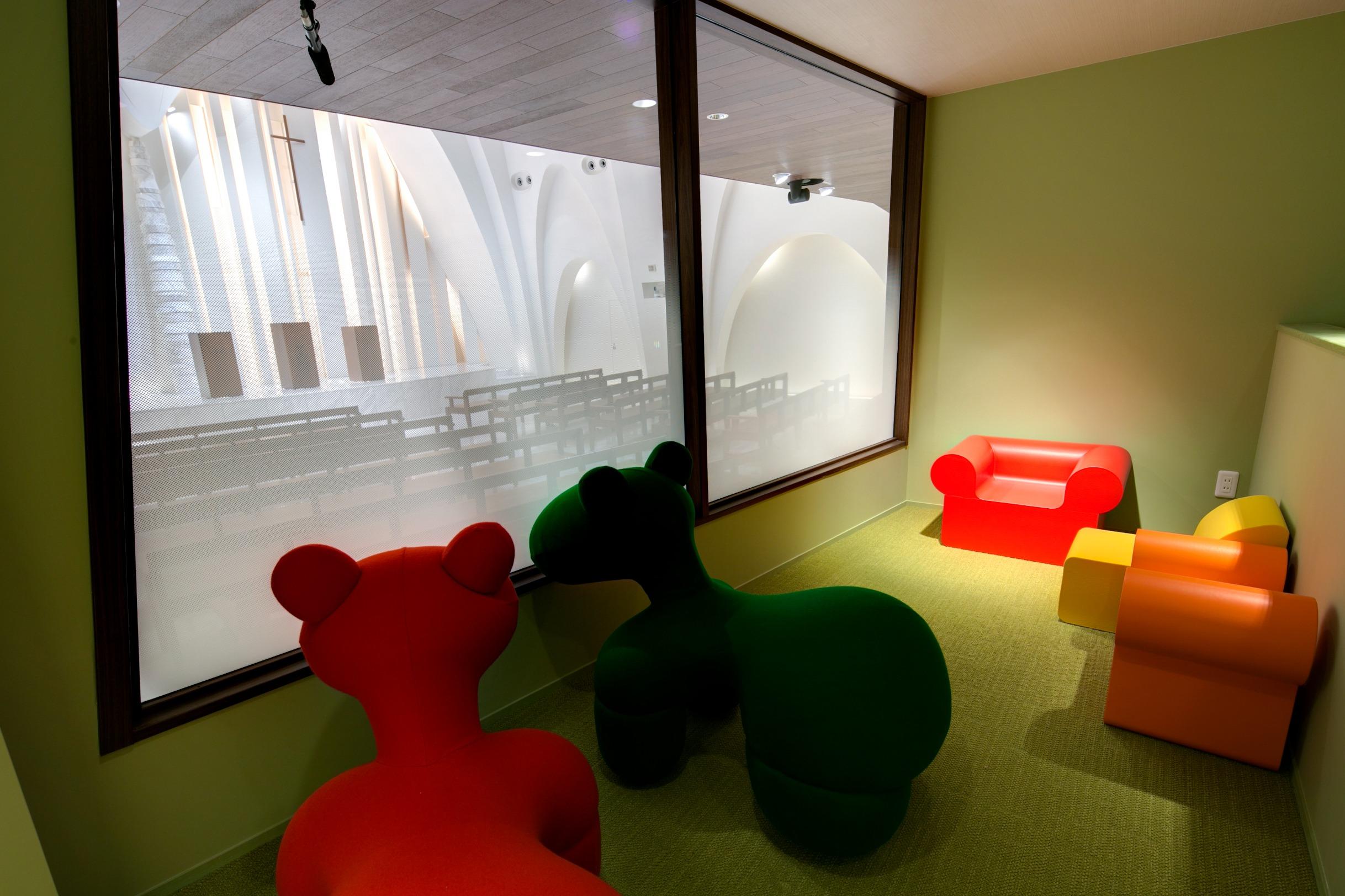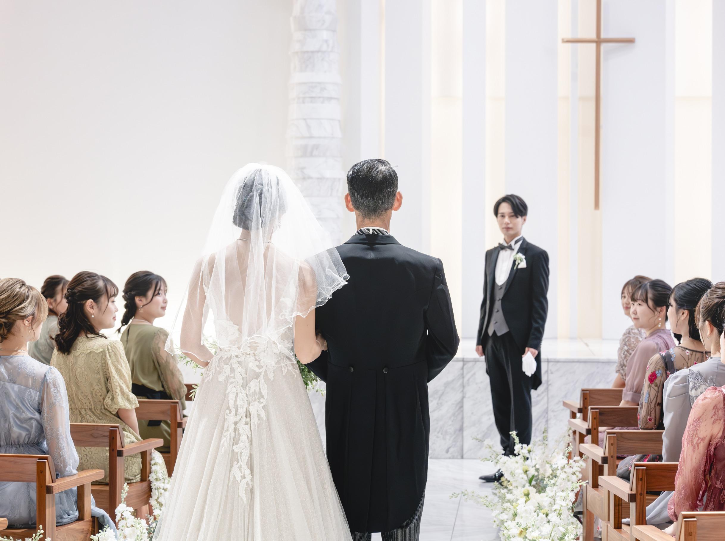 高さ10メートルから降り注ぐ真っ白な光と、緩やかな壁面が美しく融合した空間。大理石の床が輝き、聖歌隊の歌声が心地よく響くデザイナーズチャペルで、お子様用の工夫も備えた、洗練された結婚式が叶う。