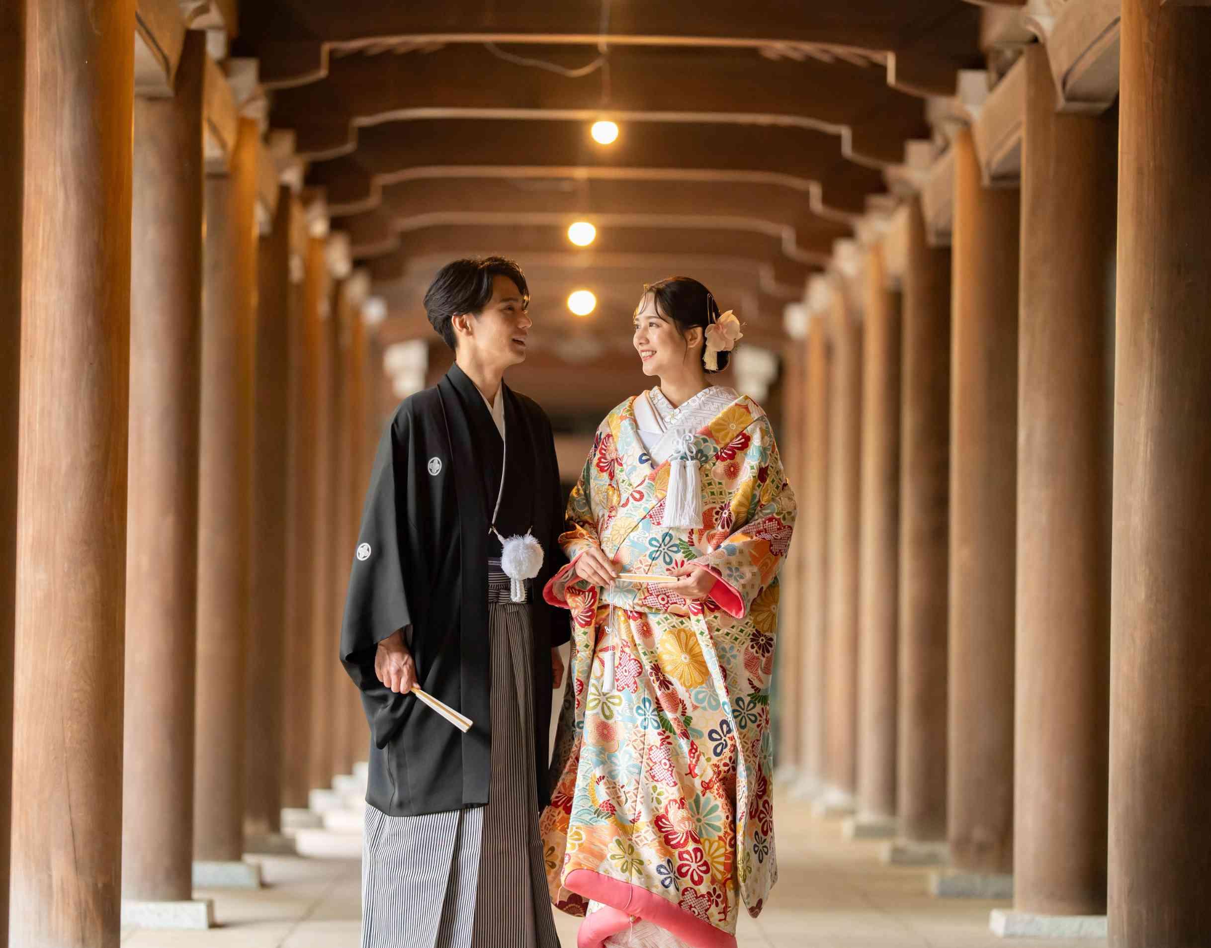 チャペル式も三嶋大社での神前式も叶う当館では、衣裳や挙式スタイルを自由に選択可能。館内には伊豆一の宮である、由緒正しい三嶋大社のご加護を受けた社「菱音」があり、そこでの挙式も叶う。