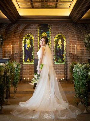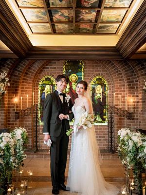 本物にこだわった空間。扉をあけて広がる景色は、イタリア、フィレンツェから譲り受けた150年前の歴史あるステンドグラス。特別な空間で愛を誓う。