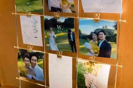 足を一歩踏み入れた瞬間から、 おふたりだけのウェルカムスペースが広がっております。 ゲストの皆様は初めての場所にご不安な思いでお越しになるので、おふたりらしい世界観にご安心していただけます。おふたりは、前撮りで撮影したお写真を飾っておりました。 「今日はどんな衣装着るんだろうね、楽しみ!」 ゲストの皆様も楽しみに挙式までのお時間をお過ごしいただきます。