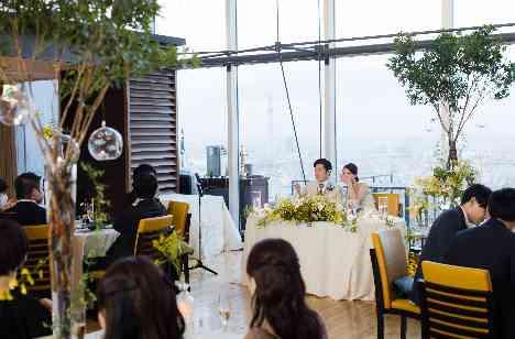 おふたりのメインテーブルを東京スカイツリーをバックにご用意。ゲストの皆様が構えたカメラの先には、東京の絶景をバックに映る素敵なおふたり。 非常にお写真映えもしますね。 装飾にもこだわっており、グリーンやイエロー、黄緑をメインとしたナチュラルなお色味で統一。 高さのある枝ものの樹をあしらいキャンドルを散りばめており、まさに天空のガーデンのよう...