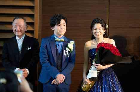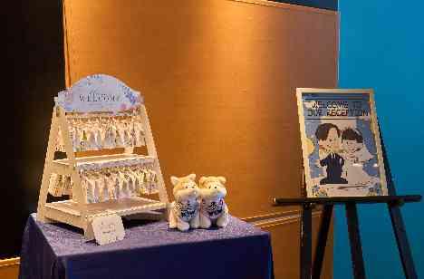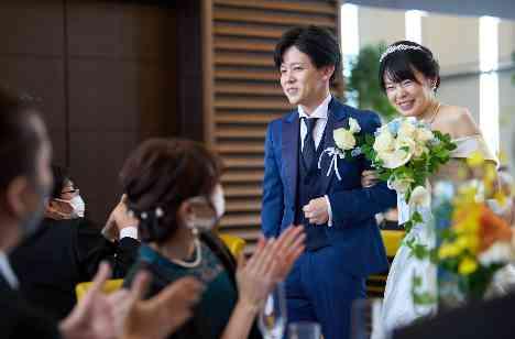 挙式を終え、披露宴会場に移動するとそこには会場装花もクロスも青で統一された会場が!そのコーディネートには思わずゲストの皆様も驚いておりました。 そんな中、皆様の祝福の受け、リラックスした表情で入場したご新郎様ご新婦様。 ネイビーのタキシードとウェディングドレスが青のコーディネートによく映える素敵な入場となりました。