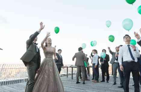ゲストの皆様におふたりのご結婚を承認いただく証として実施したのは挙式ではなく天空のバルーンリリース!おふたりの幸せがバルーンに乗って、空のようにどこまでも続きますように…そんな願いを込めて皆様でリリースをしました。 飛んでいくバルーンを見届ける時間は、おふたりの未来の幸せを全員で願う特別な時間を創り出してくれました。