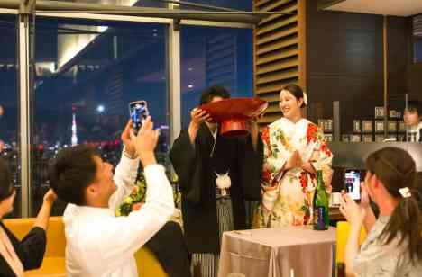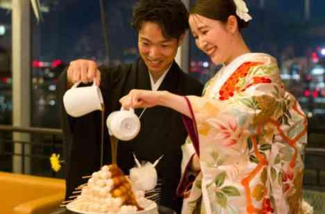 日が移り変わり会場内が夜景に囲まれた頃、おふたりは和装にお召し変えをして再入場。東京の夜景と「和」のコラボに会場も盛り上がりました。共同作業は新婦様がハマっているみたらし団子をおふたりで完成させていただきました。お団子を食べさせ合うシーンも可愛らしく、ゲスト様がおふたりの周りに集まり自然と輪ができる微笑ましい空間となりました。