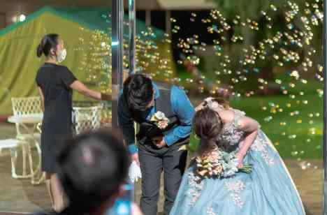 メインの扉から入場すると思いきや?!サプライズが好きで、ゲストの「驚く姿を見たいお二人は、入場のシーンをとことんこだわりました!メインの扉にスポットライトを当て、お二人の先導するキャプテンは、メイン扉前に控えています。カメラを準備していた、ゲストの皆様は「こっちか―」と入場する瞬間に歓声があがります!たくさんのシャボン玉の中幻想的なサプライズ入場が叶いました!