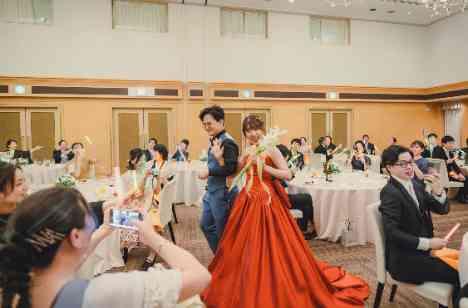 ゲストも「楽しい」を大切にされたお二人は、参加型演出を沢山ご用意! 色直しの際には、サイリウムを使用して色当てクイズ! 幻想的な雰囲気の中入場されたお二人はもちろん、 ゲストの皆様も笑顔があふれてましたね! さらに披露宴結びには、テラスで「デザートブッフェ」をご用意! ホテルパティシエ特製デザートとテラスからの景色に ゲストの皆様も大満足でした!