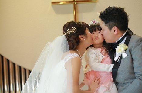 挙式中の誓いのキスは、優月ちゃんを真ん中に挟み両サイドからパパとママからの誓いのキスを行いました。お子様がいてこそ叶う、家族で愛を誓うシーン!!「これからも家族みんなで頑張ります」という決意表明のように感じました。