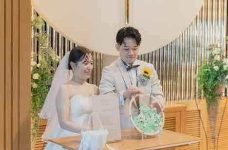 チャペル内での生演奏人前結婚式を選びました。ゲストの皆様とのご縁を大切にし、全員に参加していただきたいという想いからオリジナルの結婚証明書をご準備。ゲストの皆様には受付けで葉っぱの形をしたウッドチップに名前をご記入いただき額縁に集め、挙式の演出ではおふたりもウッドチップに名前を書き、世界でたったひとつだけの結婚証明書を完成させました。