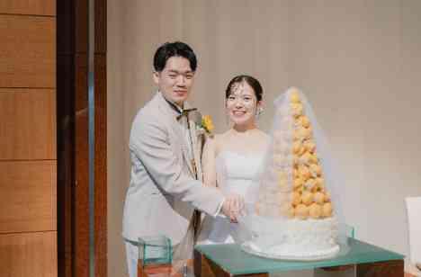 披露宴で盛り上がる瞬間のひとつとして「ケーキ入刀」。沢山デザインがある中でおふたりがチョイスしたのは小さなプチシュー(シュークリーム)を積み上げて固めた「クロカンブッシュ」です!シュークリームはお祝いの際に出される縁起の良いデザートとされており、コース料理の最後に幸せのおすそ分けとして皆様にもふるまいました。