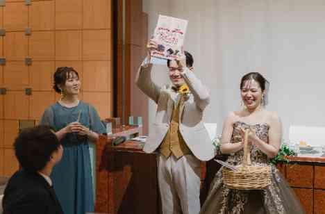 おふたりが選んだのは「カラードレスの色当てクイズ」でした。受付けで4色の箱をご準備。ゲストの皆様には「これだ!」と思う箱にお名前を書いた紙を投入していただきました。そしていよいよ再入場の瞬間。拍手と共にあちこちから「当たった~」「やった~」など沢山のお声があがりました。当選した箱の中からおふたりがくじ引きをするかのようにお名前の用紙を取り出し、当選者にはプレゼントを渡して楽しく過ごしました。
