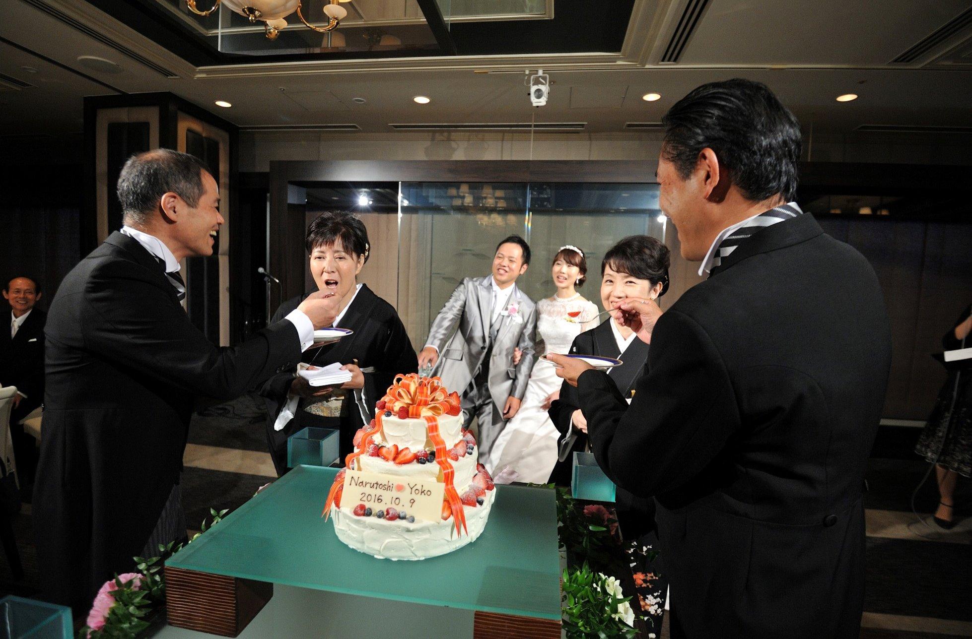 お手本バイトでゲストの皆様も大盛り上がり!!ご両家の親御様も少し照れくさそうに「アーン♡」の掛け声♪♪変わらない仲睦まじいご両親のお姿に二人も自然と笑顔に♪♪