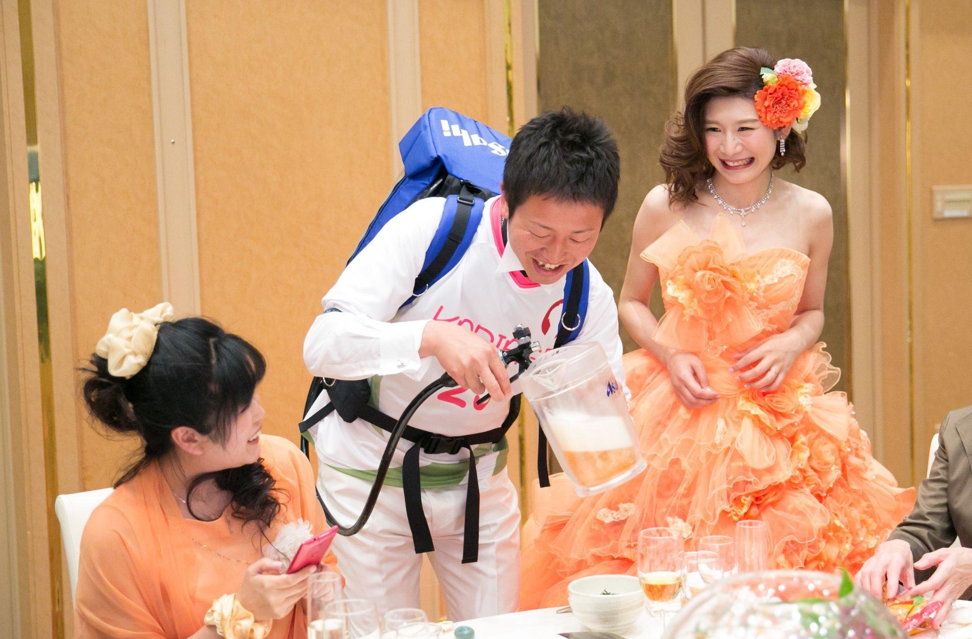 終始、ゲストの方とご一緒に過ごされるお時間を大切にされたお二人。お色直しの際には、直接感謝の気持ちを伝えられるようにと、ご新郎紘介さんがビールサーバーを持って登場し、ご新婦尚子さんはおつまみを配りながら皆さんの席まで行かれ写真撮影も行われました。