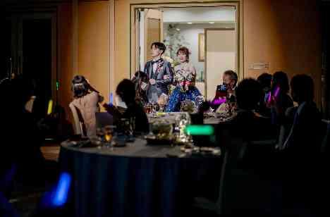 受付にドレス当てゲームとしてサイリュウムを皆さんに1本づつとってもらい、お色直しのワクワク感を味わってもらえるようにしました。大声で出すことができない分、おもいっきりサイリュームを振ってもらって、再入場したときはコンサート会場にいるような気分を味わうことができました。またその中に仕掛けを加えて、ドレスを当てた方にプレゼントを準備し、プレゼントが当たった方はとっても喜んでくれていました♪