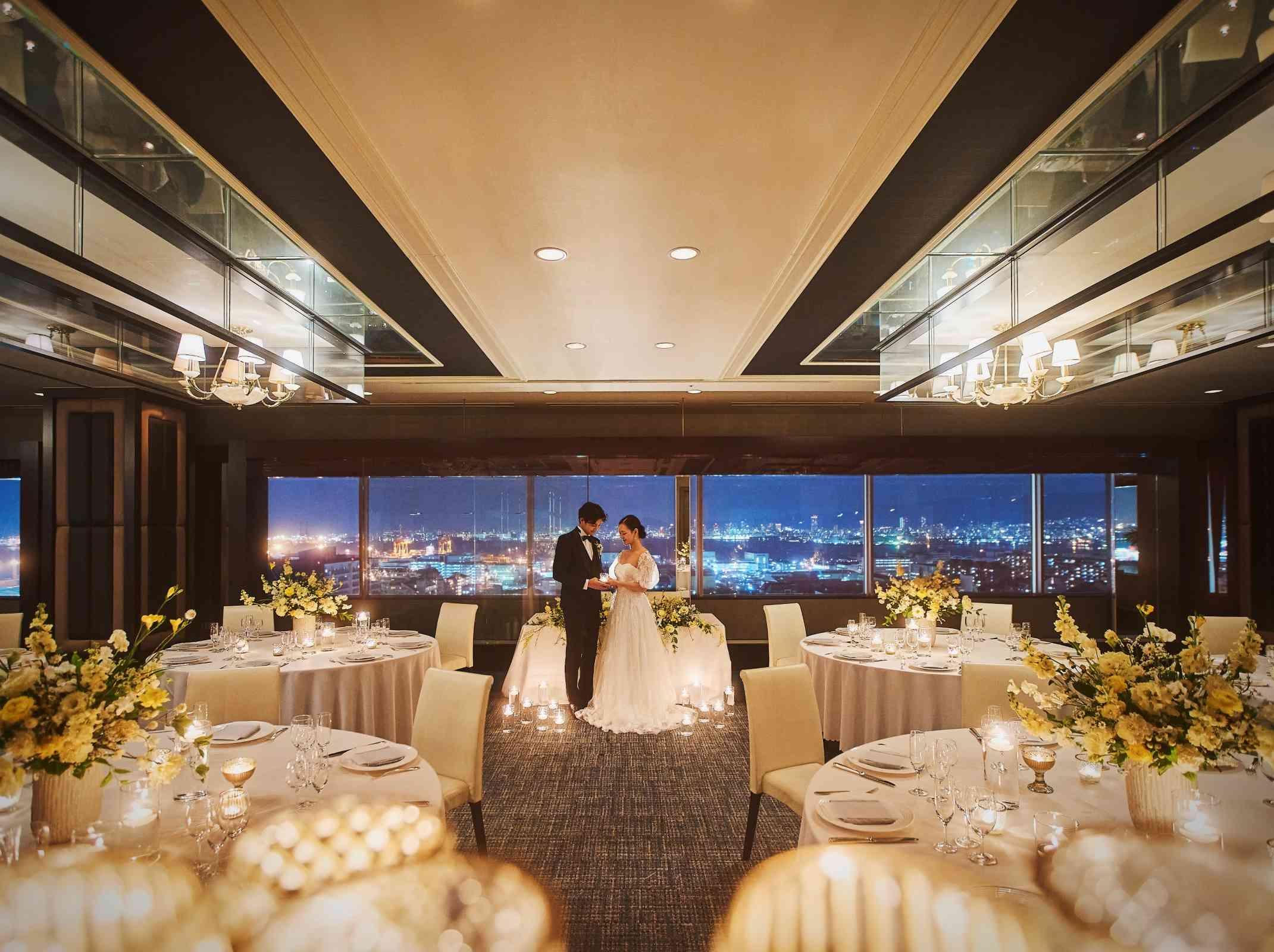 神戸といえばこの景色。空と海を望む大きな窓はゲストから歓声があがること間違いなし。室内にいながらも自然を感じることができ、窓から見える景色そのものがもてなしのひとつに(着席人数~80名)
