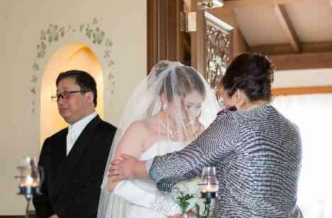 挙式はゲストの皆様に見守られながらの人前ご結婚式にて行いました。 入場のシーンではお母さまからベールダウンを行っていただいた後、お父様と一歩一歩をかみしめながら歩き、ゲストに見守られる中、家族とのつながりを感じるとても素敵な瞬間となりました。