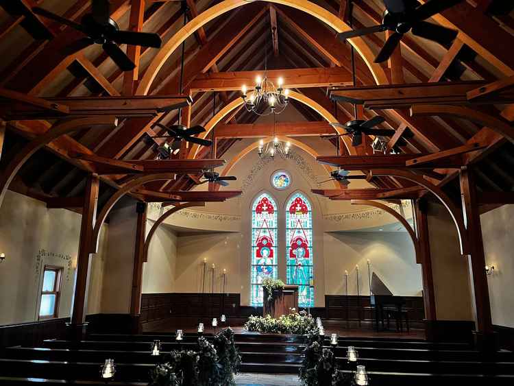 白基調ではなく、木のぬくもりが感じられる素敵な会場でした。ろうそくの光やステンドグラスも綺麗で、ゲスト距離も近いので素敵でした。