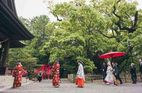 千年の楠が見守る中行われる「花嫁行列」を「参進の儀」と呼びます。これまでの家族との想いを振り返りながら、新郎様は家族を守る気持ちを新たに。新婦様はこれからも家族に守られていることを再確認する。そんな両家が一つになるのが浜松八幡宮の神前式。 鳥居から本殿までの120歩。大切に一歩一歩の歩みを進めてくださいね