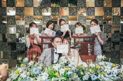 様々なことから、集まることが出来なかったこの一年。結婚式だからこそ、これまでお世話になったかた、大切な友人と過ごしたいですね。久しぶりに再会したご友人と楽しくたくさんの写真を撮影されていました。オリジナルのシートで口元を隠しながらの撮影は今だからこその演出で、そしてとてもフォトジェニック。皆さんの楽しそうな笑い声がたくさん聞こえてきた披露宴でした。