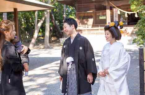 披露宴会場が敷地内にございますので、挙式後は参道でゆっくりゲスト様とお写真タイムを設けることができます。新婦様は挙式の際は綿帽子を被り、挙式後のお写真タイムでは綿帽子を外され日本髪で皆様とのお写真タイムを楽しまれました。ご結婚式を挙げられた浜松八幡宮を背景に、ご結婚式にお越しいただいたゲストの皆様と撮影したお写真はお二人にとってもゲストの皆様にとっても、とても良い思い出の一枚になったかと思います。