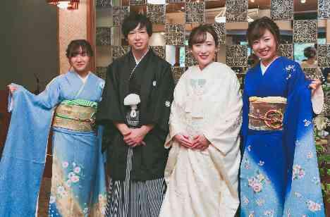 新婦様のブライズメイドは和装に合わせて「青の振袖」で列席されました。花嫁とおそろいの衣装を着て花嫁のお世話をし、親友ゲストの中でも結婚式の立会人など、具体的な結婚式の進行にも関わっていただくブライズメイドのお二人は、青い振り袖姿で受付係を務めてくださいました。青い振り袖姿のご友人が受付に立つことで、ご結婚式の入口から新郎新婦様らしさが感じられました。