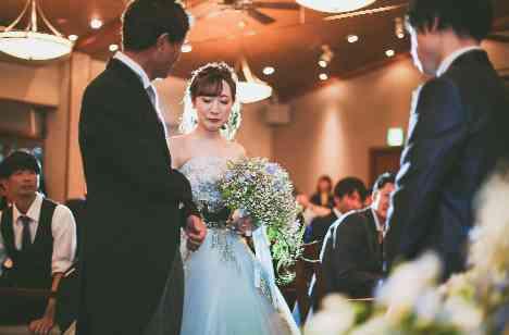 青いタキシードと水色のカラードレスに御色直しをされました。再入場の演出は新婦様お父様とのチャペル風入場です。お父様には当日までのサプライズでした。神前式は参道をお母様と歩いていただきます。まさか披露宴の中で一緒に入場するとは思っていなかったお父様は、初めは驚いた様子でしたが、新婦様に腕を組まれ緊張した面持ちで少し涙を浮かべながら新郎様の元までエスコートして頂きました。感動的なシーンとなりました。