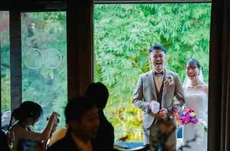 挙式後は白無垢からウェディングドレスへお召し替えをし披露宴入場! 入場ギリギリまでカーテンを閉め ガーデンテラスからサプライズ風の入場をしました✨ ゲストの皆様のお顔を見た瞬間とっても嬉しそうな表情のおふたり とっても可愛い素敵なワンカットです♡ 半年間ゲストの皆様を思い考えてきた大切な1日だからこそ、最高の表情に感じます!