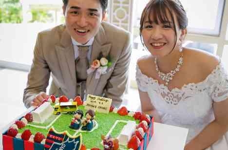 サッカーが大好きな私たちなので、ウェディングケーキをサッカーコートにしました。打ち合わせをしていくうちに、だんだん楽しくなって、細部にまでこだわっていったのですが、ケーキを作るパティシエさんが、全て形にしてくれました。正直、食べるのがもったいなかったです。