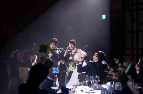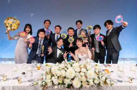LIVE会場のような臨場感を大切にされ、各ゲストテーブルの席札は「うちわ」でご用意♪ ゲストが会場に入った途端、おふたりの創りあげた空間に入場前からボルテージ最高潮! さらにBGMは本格的なライブサウンドシステムを導入し、アイドルソングで入場!おふたりが皆様にファンサービスをしながら会場をラウンド!まるでコンサートのように一体感あふれる楽しい時間となりました。
