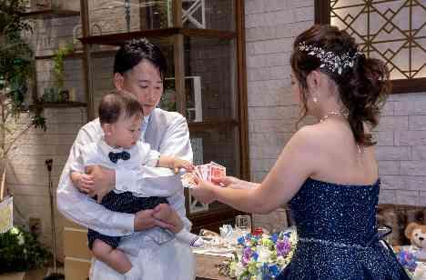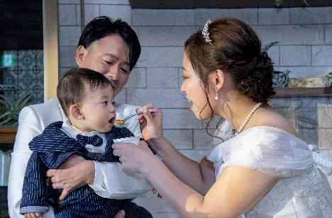 ウェディングケーキの演出では通常のケーキ入刀→新郎新婦ファーストバイトを行いました。その後に愛息子に「離乳食バイト」を♪お昼寝の時間やご機嫌次第で出来ないかなーとも思っていたのですが、無事に出来て愛想も沢山振りまいてくれて大成功でした。ベルクラさんはファーストバイトのアイテムも柔軟に提案してくれるので楽しいですよ!