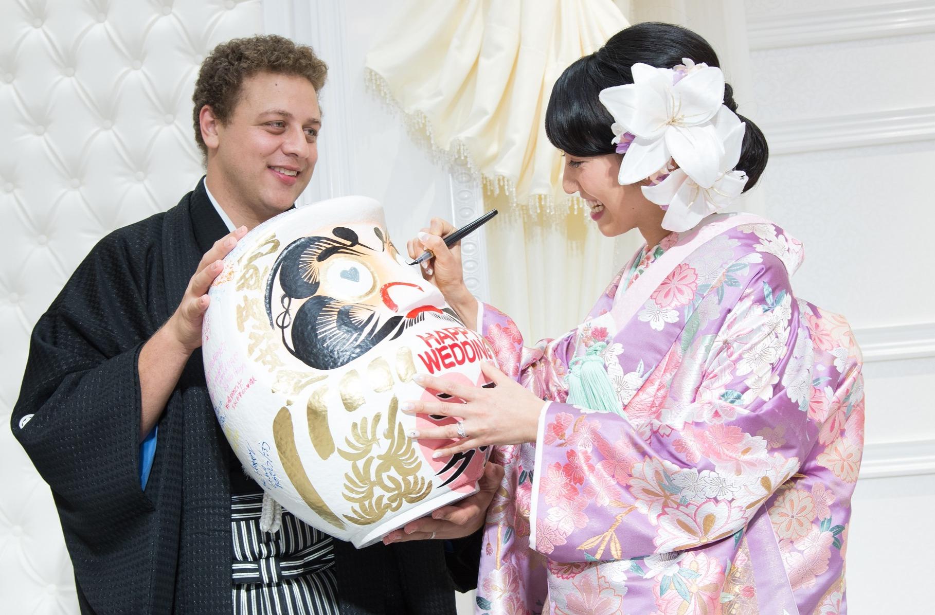 中でも盛り上がったのは、受付でメッセージを書いてもらった「白だるま」を持っての和装入場!お二人それぞれダルマにハートの目を入れたとき、それはその日一日を刻む大切な宝物がゲストとお二人によって完成された瞬間でした!