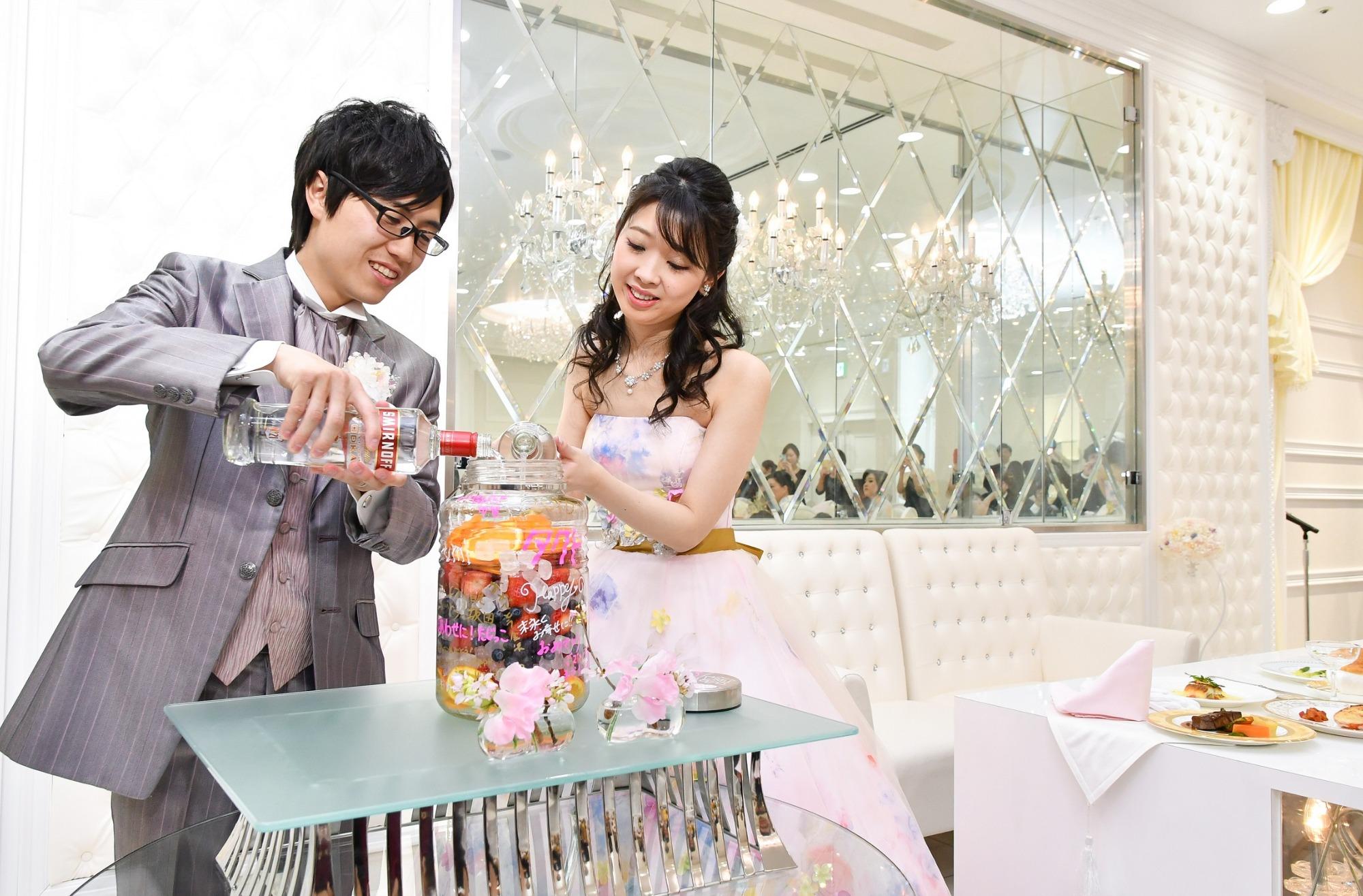 受付時にゲストの皆様にメッセージを書き込んでもらった 世界に1つだけのボトルに いちごやブルーベリー、オレンジといった果実を ご友人様たちに入れてもらい 最後にお二人がお酒を注ぎ完成~☆!! 2ヶ月後にはみんなで作った果実酒ができあがる ゲストも楽しめる素敵な演出をされました!!