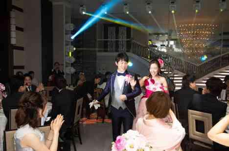 オープンしたばかりのコンコード、最大の演出が「大迫力のライティング演出」。 ライブのような臨場感のある光の演出と共にダブル階段から登場するお二人はとっても素敵で、二人が踊り場で落ち合い手を取るシーンではスタッフもうっとり。