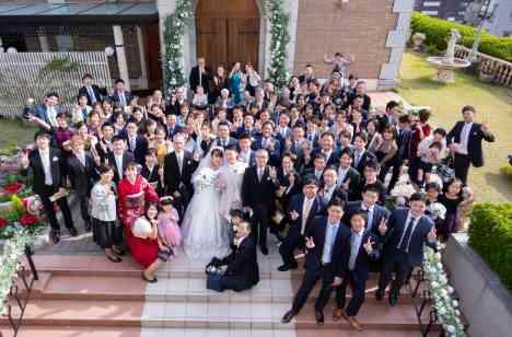 当日は雲一つない青空の下、みんな笑顔でハイポーズ! フラワーシャワーで祝福された後、新婦様からのブーケトス、新郎様からの野球ボールノックトス。 お二人にとってもゲストの方にとっても「宝物」になるショットになりました!