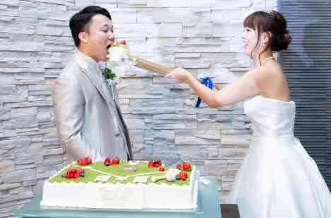 ウエディングケーキのセレモニーでも野球が登場しました!グラウンドに見立てた芝生や道具、ベースを再現。 新郎様へのファーストバイトは木製バットで「あーーん」 大好きな野球のバットで食べるケーキは最初で最後かも!?その後は親御様によるお手本バイトも! 親御様の普段見れない食べさせあいは親族の方も心がほっこりなる瞬間でした。