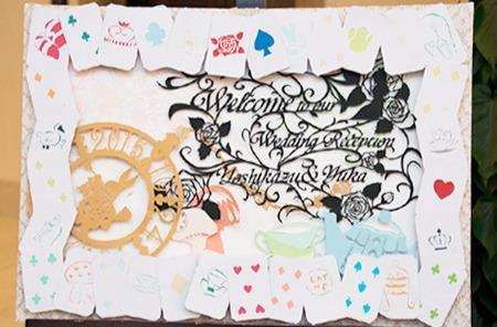 毎回笑いのあふれる打ち合わせで、準備も楽しくできました♪ また、テーマが不思議の国のアリスなのでウェルカムボードも切り絵で日付とうさぎをいれたりと素敵でした!