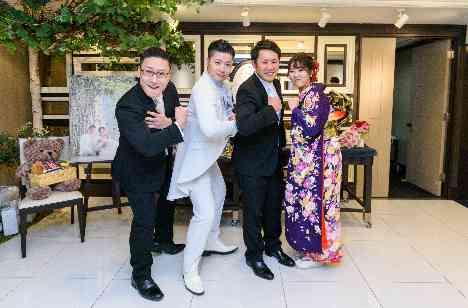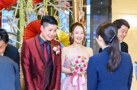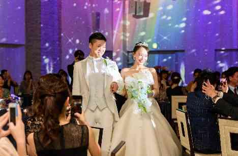 オープニングでプロジェクションマッピングをやったところ、みんな「こんなの見たことない!」と喜んでくれました。お色直し入場の時は、会場内の階段から登場しました。私は桜色のドレス、ダンナさんはワインレッドのスーツを着たのですが、とても評判が良かったです。会場が真っ白だったので鮮やかな色がよく映えました。 双方の友人たちがメッセージムービーを作ってくれるなど、余興を含め演出もたくさんありました。