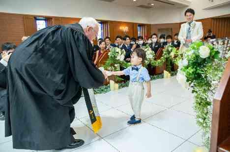 とにかく緊張しました。それを和らげてくださったのは、やさしい牧師さんと、チャペルの扉が開いた瞬間に見えたゲストのみなさんです。特に久しぶりに会えた友人とは、おしゃべりしたい気持ちでいっぱいになって、緊張も吹き飛びました! 友人の息子さんがリングボーイをしてくれて、あたたかい雰囲気の挙式になりましたね。