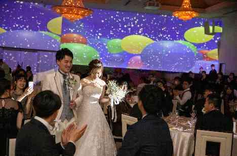 沢山のゲストの方に来ていただきました。フォトラウンドはテーブルが16卓あって時間がかかったので演出を詰め込みすぎずに正解でした。ゲストともひと通り言葉を交わすことができました。プロジェクションマッピングはすごい盛り上がりでしたが、前を歩いている自分たちはどうなっているかよく分からなかったので、後で写真を見ると「わぁ~!」と驚いている様子が分かって。こんなに華やかだったんだ! と改めて思いました。