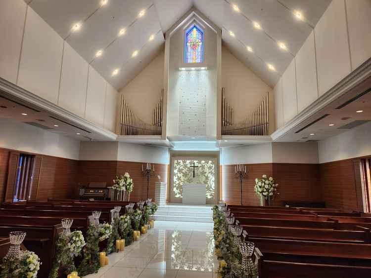 チャペルの中はとても雰囲気が暖かくて素敵でした。チャペル前のお庭もお花がたくさん咲いており、可愛らしい雰囲気でした。その他、ホテルの中はシャンデリアや階段がありましたが、他の式場と変わりないかなと思いました。