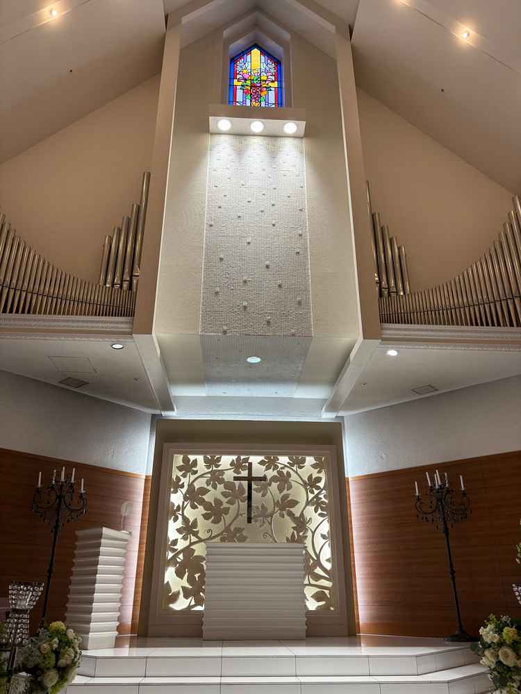 チャペルは綺麗で、披露宴会場は全体を見渡せる大きな階段がとても素敵でした。チャペルへの雨天時用の通路が少し窮屈には感じました。