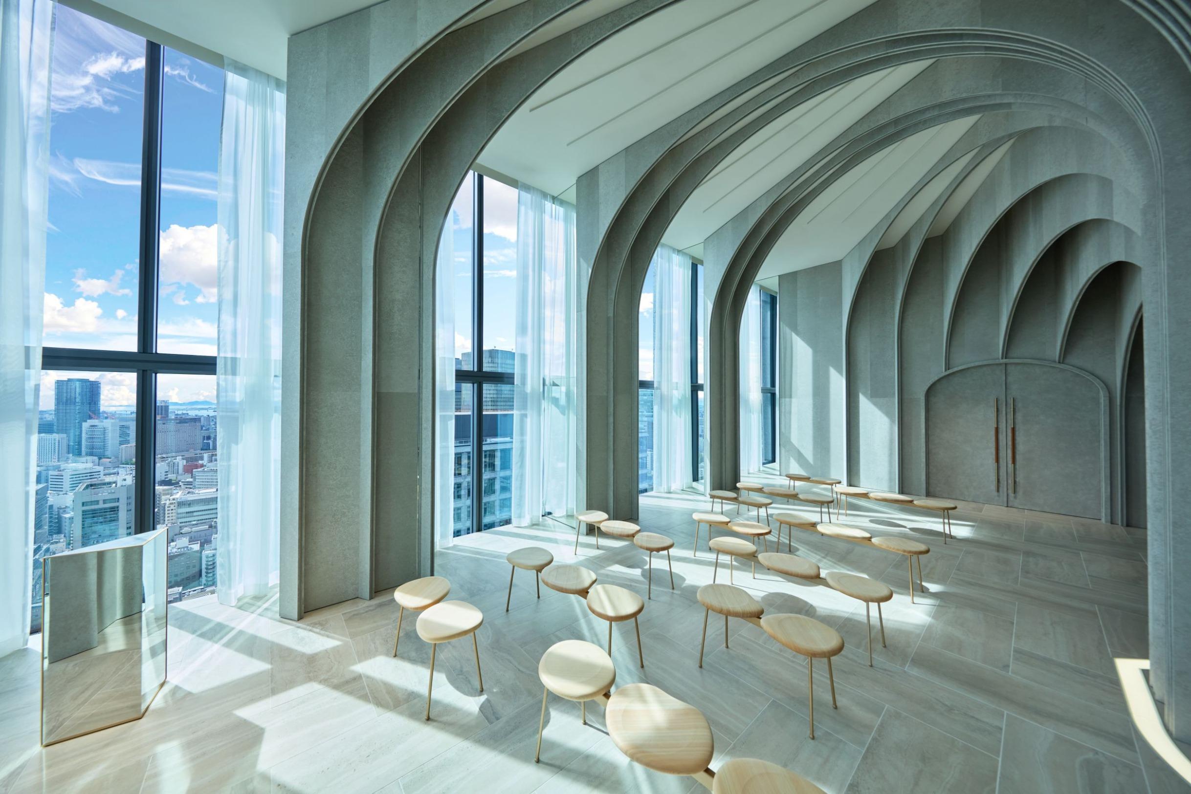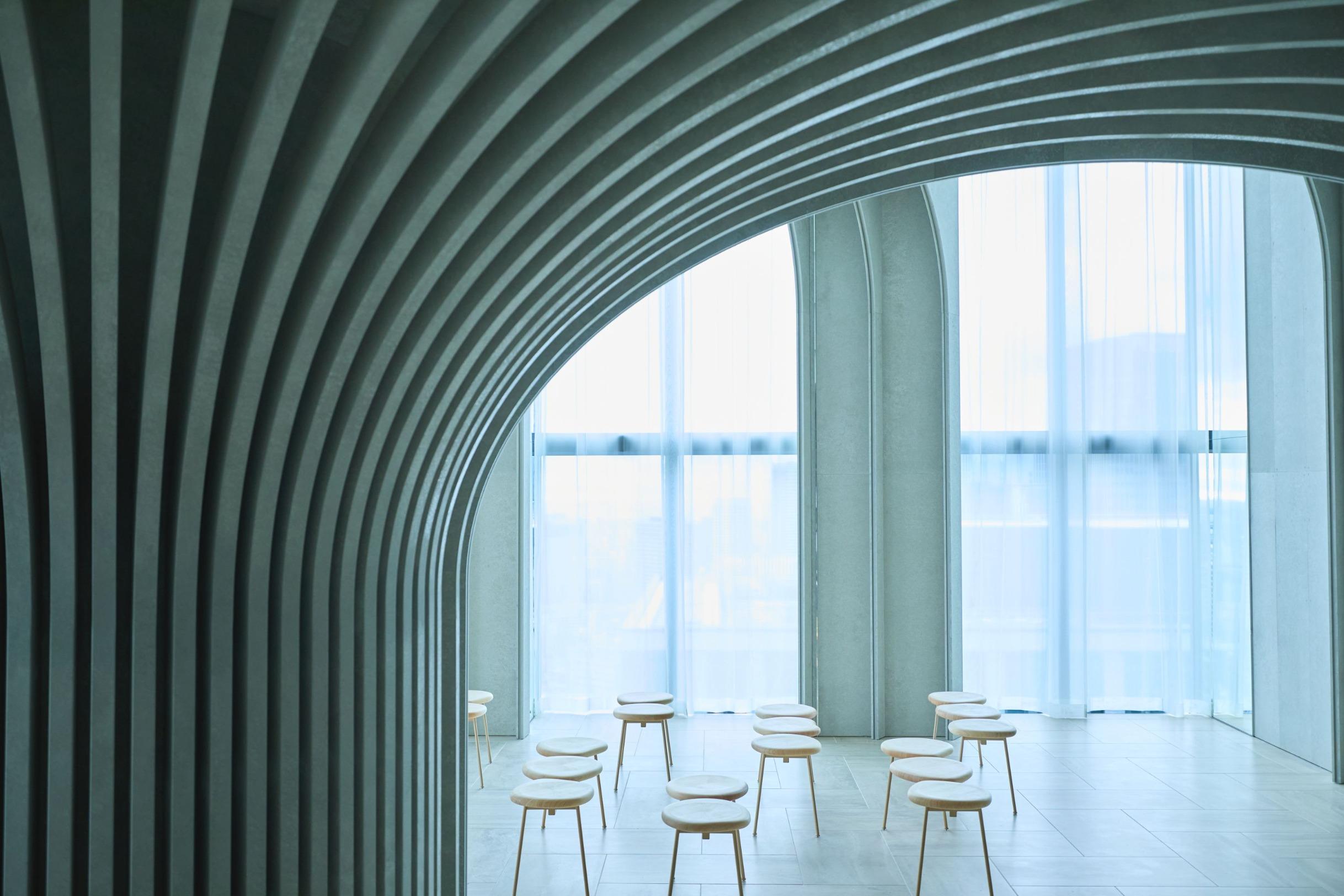 大樹のようなアーチ曲線で構成された柔らかな空間に自然光が差し込み、時々刻々と豊かな表情を見せる。 歩く姿が絵になるドラマチックな光と影の空間は、忘れられない思い出を刻む祝福の場に相応しい優美な場。