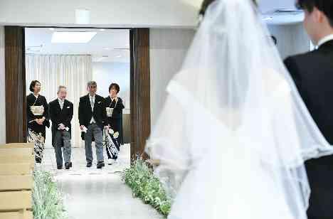 おふたりのファーストミートの後は、両家両親を呼んでファミリーミート。お父様へブートニア・お母様にはハンカチを贈りました。衣裳合わせやお打合せも一緒に来館するほど仲の良い、ご新婦様とご新郎様のお母様。挙式入場前には、ベールダウンのセレモニーをお願いしました。おふたりを見守る大きなシンボルツリーには、陽光をイメージしたサンライトボールをコーディネート!“これからの未来に光があふれますように”