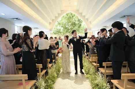 木漏れ日のような温かな光に照らされ、ふたりを優しく見守るように佇むシンボルツリー。 新郎様はお母さまからジャケットセレモニーを、新婦様はお母さまからベールダウンからスタートした挙式。 最上階のセレモニースペース「LIFE tree(ライフツリー)」では、”ふたりとゲストが繋がる”アットホームな挙式が叶います。