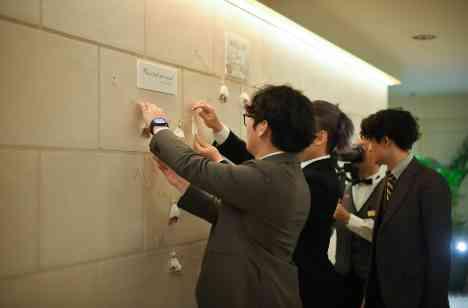 At the Balconyでは、会場に入るまでに長い回廊がございます。その回廊に、おふたりやゲストの皆様とのお写真を飾ることができます!また、このお写真のようにゲストの皆様へのお手紙をご用意をして、挙式から披露宴のお待ちいただくお時間さえも楽しんでいただける演出になってまいります。入場の前にそんなお時間があるとおふたりの入場の期待度が高まるのと、披露宴の前から盛り上がるお時間間違え無しです!