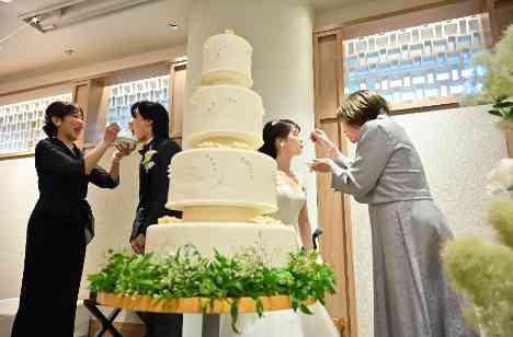 ケーキの入刀をした後、おふたりが行うファーストバイトや感謝の気持ちを伝えるサンクスバイトなど沢山ありますが、おふたりは幼少期を思い出す、お母様に食べさせてもらう「ラストバイト」を実施!「今日までありがとう!」であったり、「あの頃を思い出すね」などお母様との思い出に浸りながらお過ごしいただく温かいシーンです!この素敵なシーンでさえも皆様に見届けていただけるような近い距離感になっております。