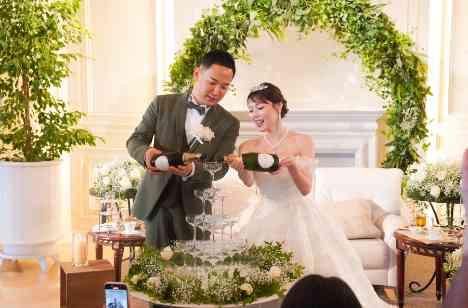 会食のようにお話とお料理・お酒を楽しんで欲しいと、皆さまへのおもてなしを考えたお二人は、シャンパンタワーをご用意!お酒好きの皆さまは、「早く飲みたい~!」と盛り上がっていて、迫力もあるのでカメラを持ちながら、おふたりのシャンパンを注ぐ瞬間に釘付けでした!この後は、しっかりと皆さまにご提供をして、シャンパン片手にお話しが盛り上がっていました!