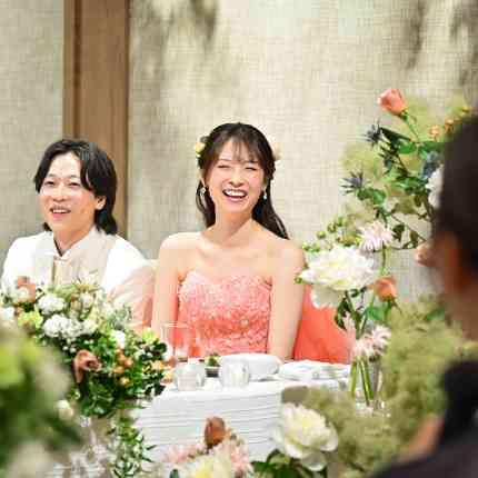 おふたりがお過ごしいただく、メインソファでは高砂と言われる段差があることが一般的にはなりますが、コンチネンタル横浜では、あえて高砂の段差を作らずゲストの皆さまと同じお目線でお過ごしいただける形になります。ゲストの皆さまも「今おふたりの場所に行っていいのかな」というお時間も生まれず、いつも通りに話ながら自然体なお写真がお撮りでき、沢山ゲストの方とコミュニケーションがお取りいただくことができます!