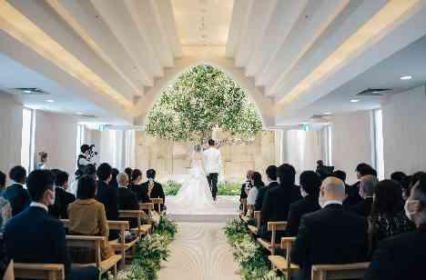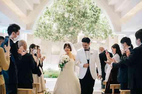お母さまからの「ベールダウンセレモニー」から、おふたりの挙式はスタートしました。シンボルツリーの緑と陽光を感じる温かな雰囲気の中、厳かに執り行われたセレモニー。退場のシーンでは、緊張がほぐれ自然な笑顔のおふたりと、大きな歓声と拍手で祝福するゲストの表情が印象的でした。